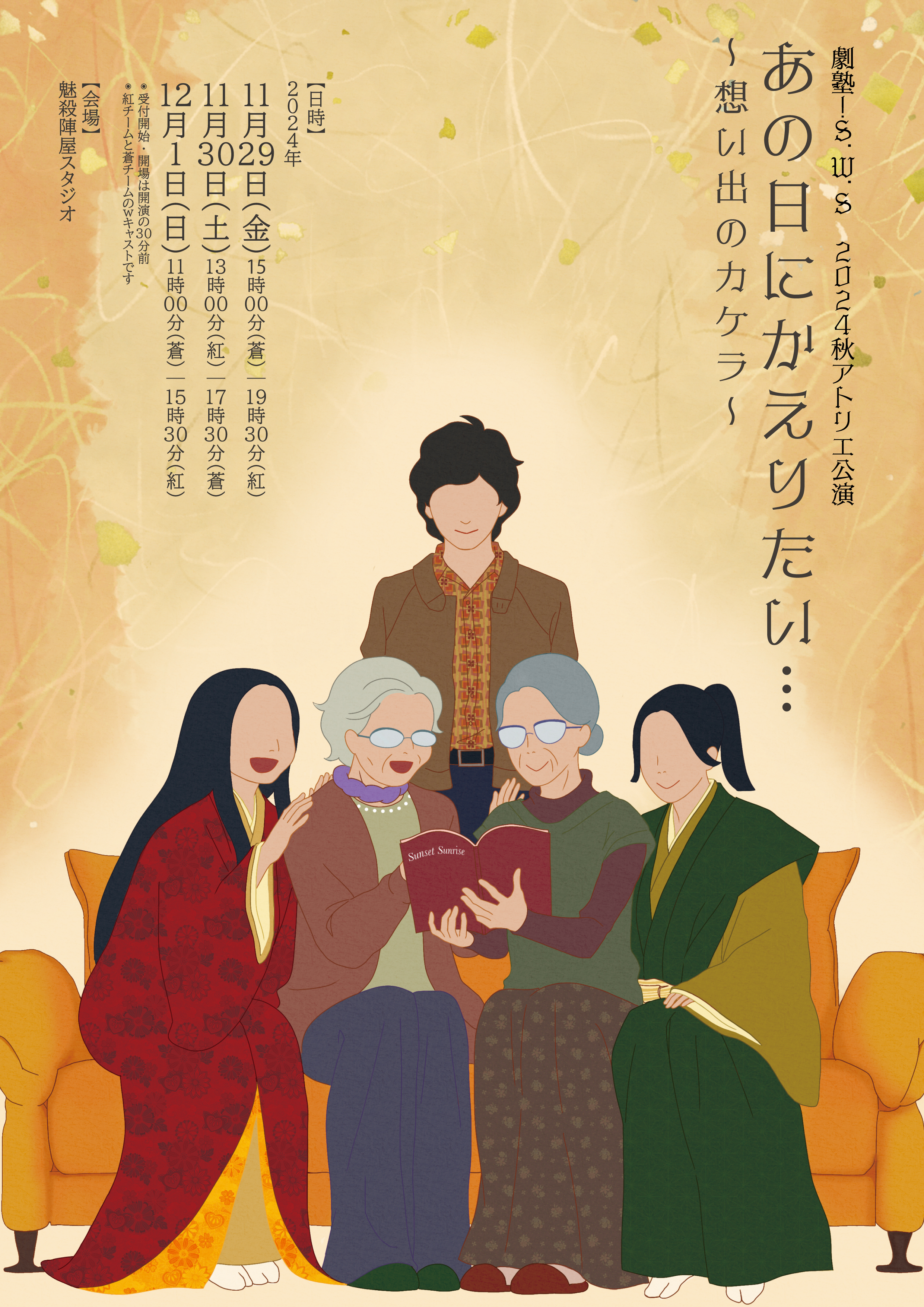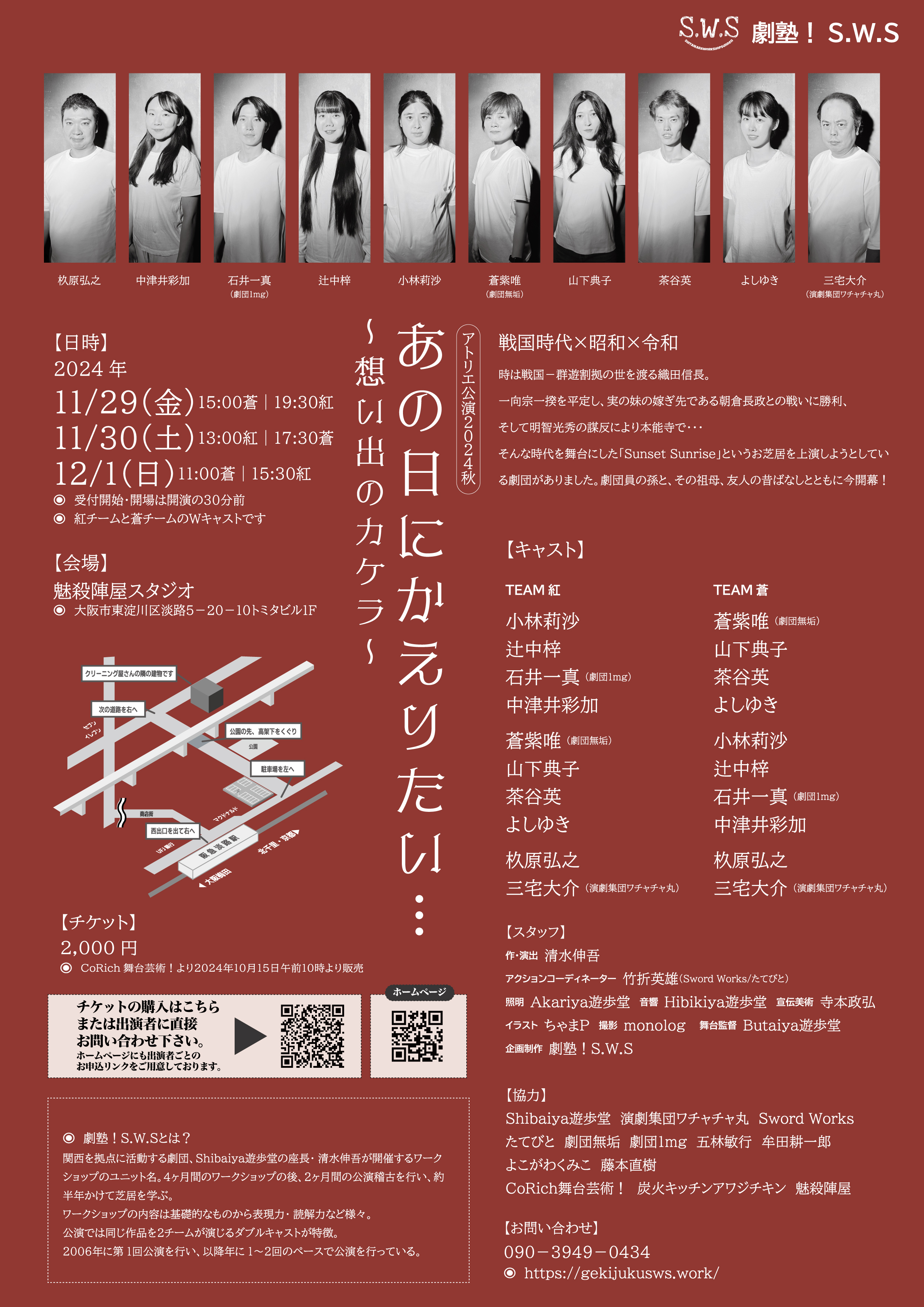 辻中 梓 https://ticket.corich.jp/apply/363460/002/ 蒼紫 唯 https://ticket.corich.jp/apply/363460/003/ 石井 一真 https://ticket.corich.jp/apply/363460/004/ 吉岡 莉来 https://ticket.corich.jp/apply/363460/005/ 神澤 蒼介 https://ticket.corich.jp/apply/363460/007/ 西川 亜樹子 https://ticket.corich.jp/apply/363460/006/ <STAFF> 作・演出 清水伸吾 照明/Akariya遊歩堂 音響/Hibikiya遊歩堂 宣伝美術/寺本政弘 撮影/monolog 舞台監督/Butaiya遊歩堂 企画制作/劇塾!S.W.S <協力> Shibaiya遊歩堂 劇団無垢 五林敏行 牟田耕一郎 よこがわくみこ 藤本直樹 西川亜樹子 中津井彩加 CoRich舞台芸術! 炭火キッチンアワジチキン 魅殺陣屋 |